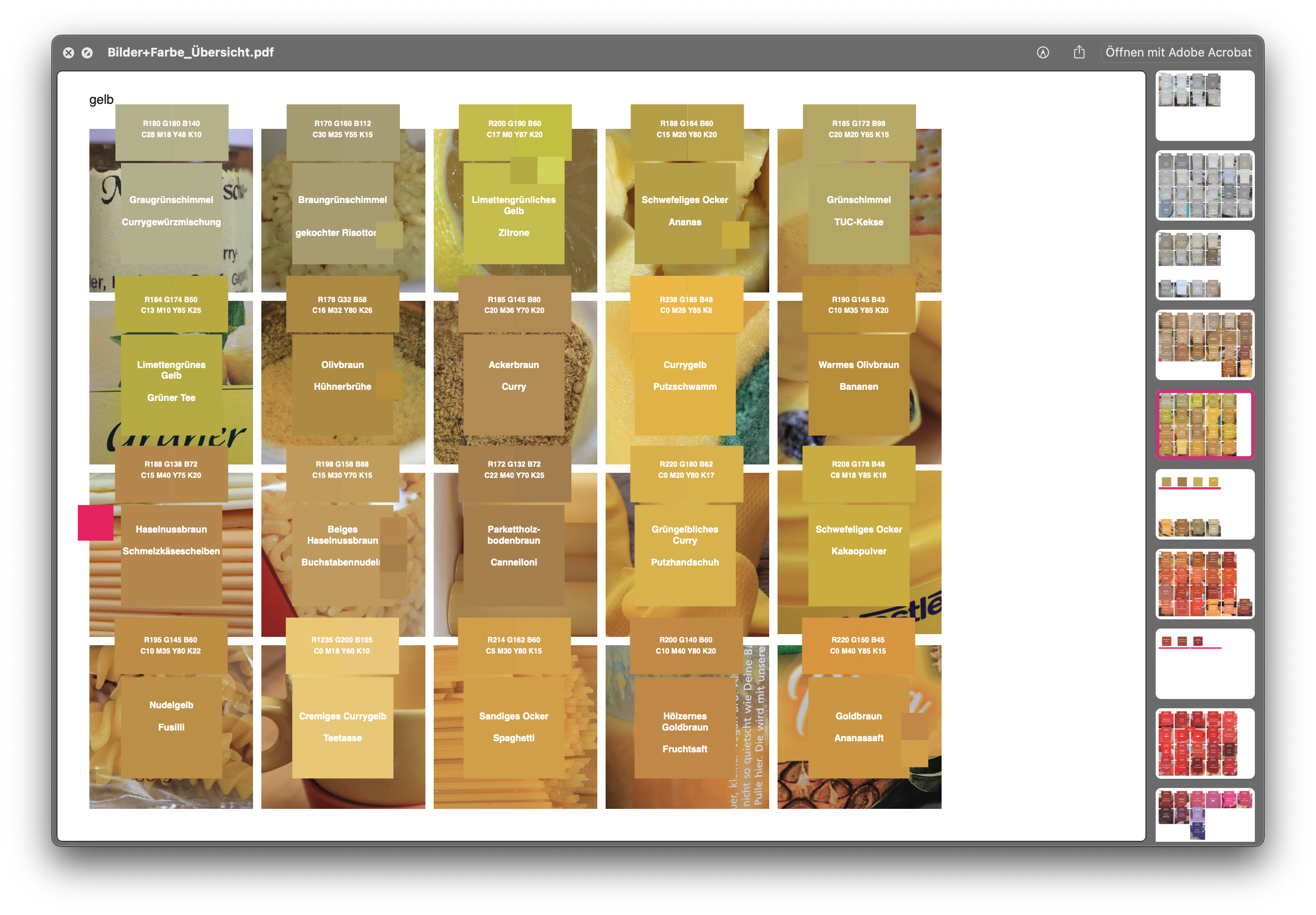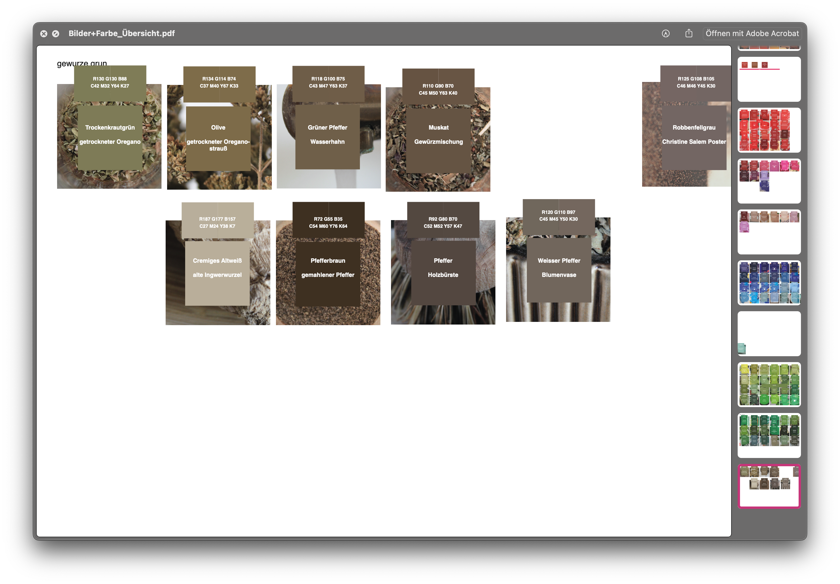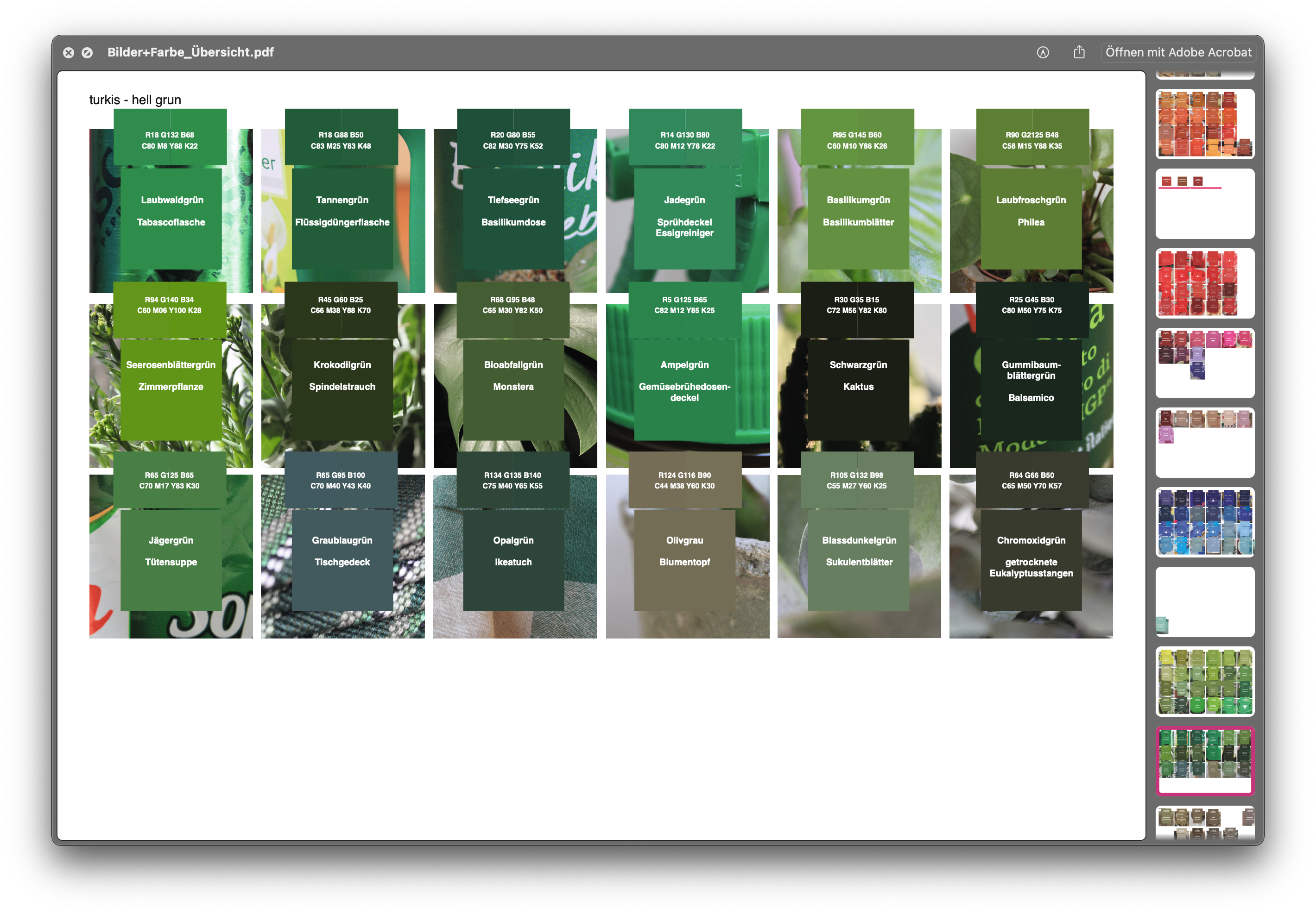 meiner Isolationsraum Küche durch verschiedene Medien – diese war der Schwerpunkt dieser Projekt. Für die Wiedergabe und Reproduktion der Raum habe mich dazu entschieden eine Farbskala zu entwickeln. Die auseinandersetzung von Farbräume und Farbdefinitionen im Print + Online, sowie die Kalibrierung und Vergleich verschiedene Endgeräte, aber auch der Spiel und Erfindung von Wörter die genau das Objekt und der Farbe beschreiben – vor Augen: einen frischen neuen Limette-grüne Monsterablatt, der eben aufgeht.