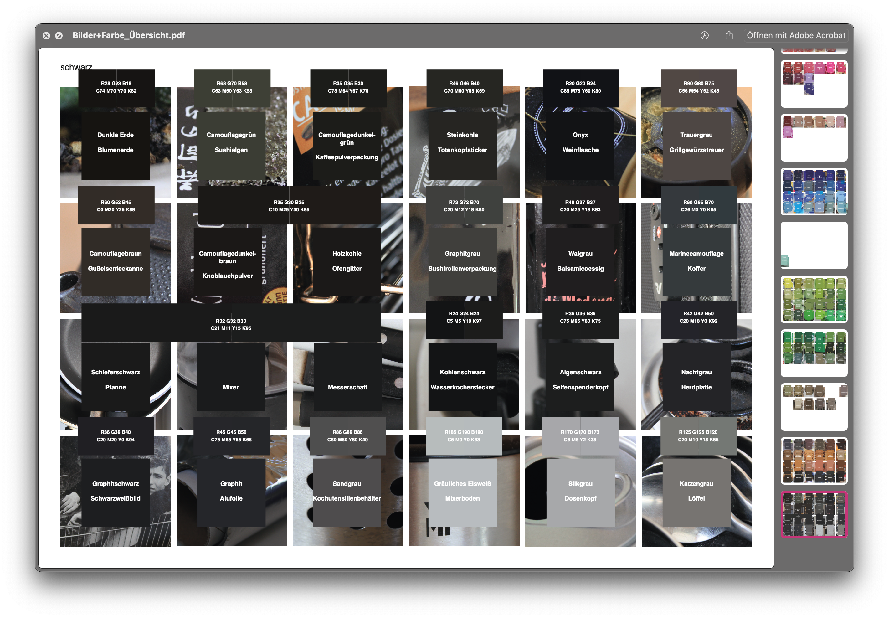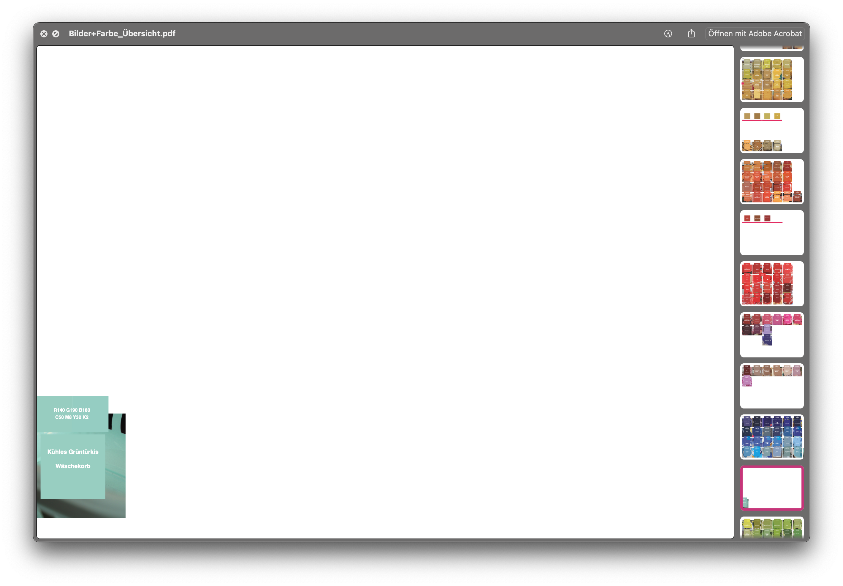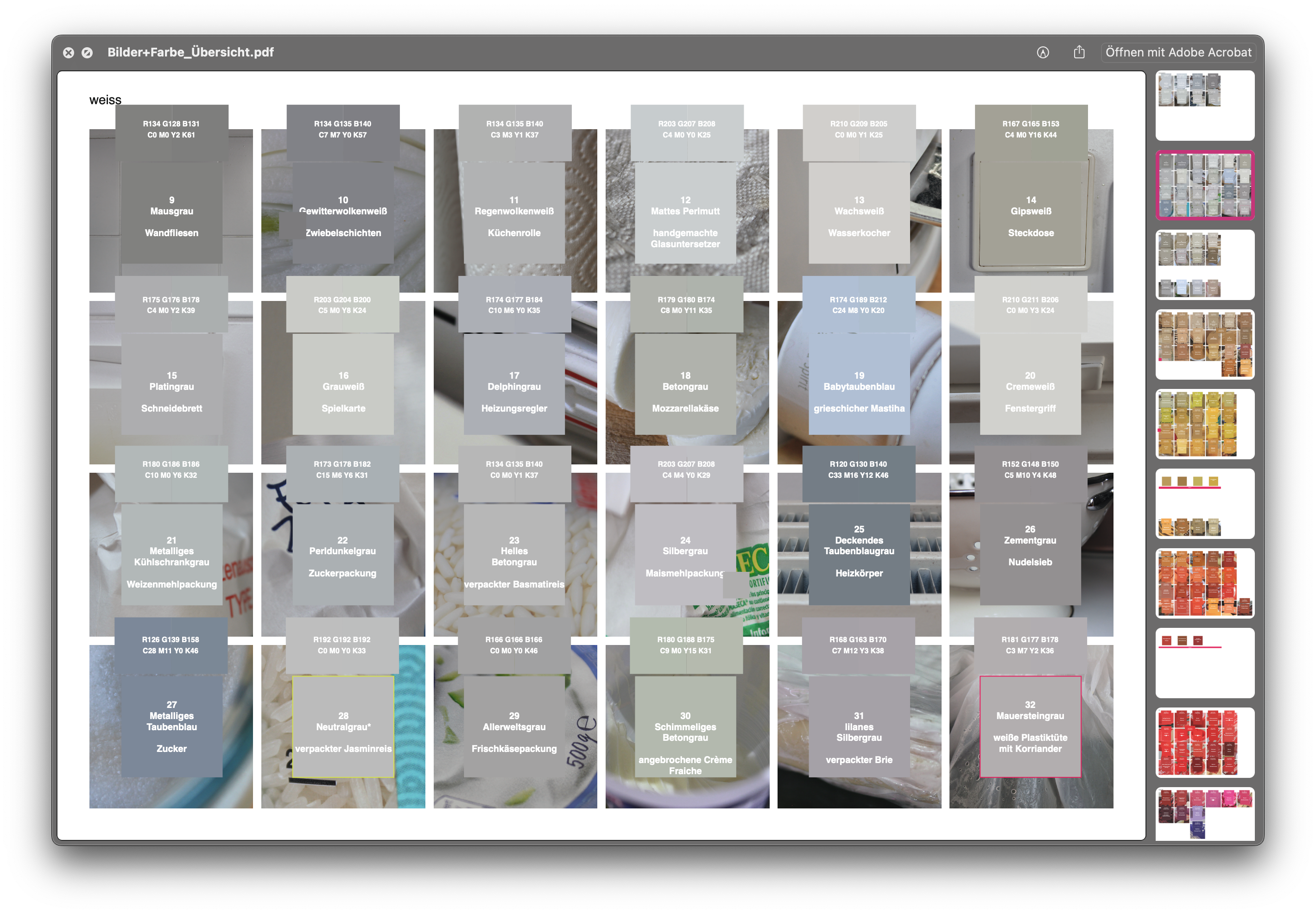 meiner Isolationsraum Küche durch verschiedene Medien – diese war der Schwerpunkt dieser Projekt. Für die Wiedergabe und Reproduktion der Raum habe mich dazu entschieden eine Farbskala zu entwickeln. Die auseinandersetzung von Farbräume und Farbdefinitionen im Print + Online, sowie die Kalibrierung und Vergleich verschiedene Endgeräte, aber auch der Spiel und Erfindung von Wörter die genau das Objekt und der Farbe beschreiben – vor Augen: einen frischen neuen Limette-grüne Monsterablatt, der eben aufgeht.